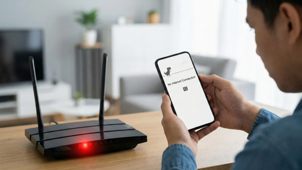 - Luzes normais, mas sem navegação: Se o roteador diz que está tudo verde, mas o celular não carrega nada, o problema é interno. Culpa do Roteador. Ele travou o processamento ou o Wi-Fi “engasgou”.