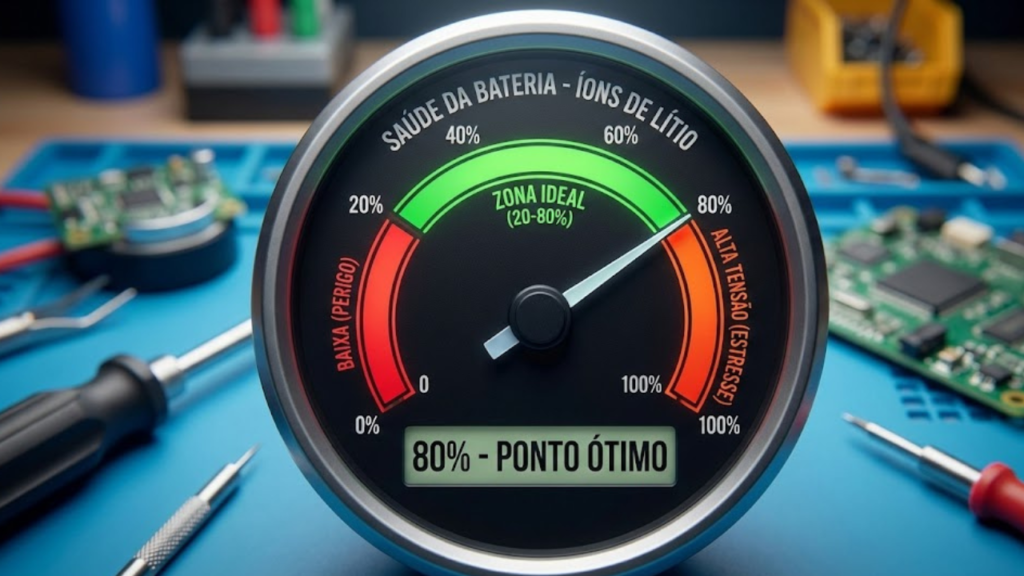 A bateria funciona igual. Segundo engenheiros da Cadex Electronics (laboratório líder mundial em testes de bateria), as baterias de lítio funcionam na base da “voltagem”. Quanto mais perto dos 100%, maior a tensão interna. Manter a bateria em 100% é como manter o elástico esticado no limite: desgasta a química muito mais rápido do que deixá-la em 80%.